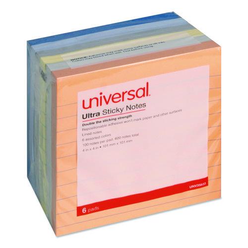 Ultra Sticky Note Pads, Note Ruled, 4" x 4", Assorted Colors, 100 Sheets/Pad, 6 Pads/Pack